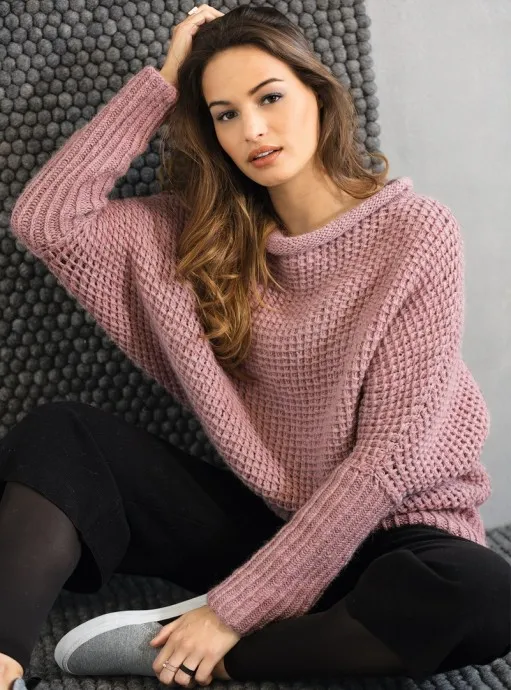 Уютная пряжа, объемный силуэт «летучая мышь» и несложные узоры делают этот джемпер образцом уютной одежды для прохладной погоды.