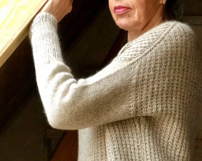 Стильная модель женского свитера оверсайз, связанного из двух видов тонкой благородной пряжи на спицах 4.5 мм. Свитер вяжется от воротника (который подворачивается на изнанку и подшивается изнутри) с прибавления по типу реглана погон. Сначала все петли вяжутся обычной резинкой 1х1, потом узором резинка "кукуруза" (только в этом случае изнаночная сторона идет с лица). Рукава вяжутся от пройм чулочной вязкой и резинкой 1х1.