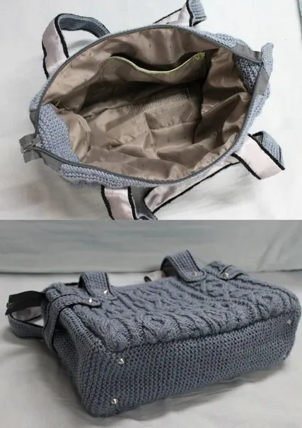 Работу выворачиваем. Шьем подклад: из двух прямоугольников размером примерно 43*28. По желанию можно пришить кармашки для мелочей или телефона. К вязаному полотну пришиваем молнию.