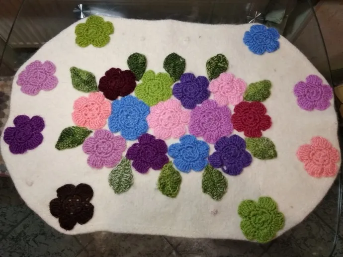 Связался и свалялся коврик молочного цвета из рассказовской шерстяной ровницы.Цветочки связала из пряжи мохер деликат,реал 40 и ангора кролик.Цветочки расположила вразброс.пришила только серединки.так как не знала как мохер сваляется.И правильно сделала.не свалялись совсем.Зато коврик с размера 130 на 95 см свалялся на 90 на 60 см,очень мягкий теплый войлок получился.