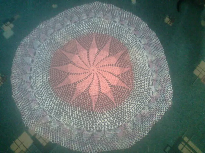 Связала эту скатерть очень давно, еще когда мой старшенький сынок ходил в садик. Воспитатель попросила связать на маленький столик в игровую зону. Она получилась немного больше метра в диаметре.