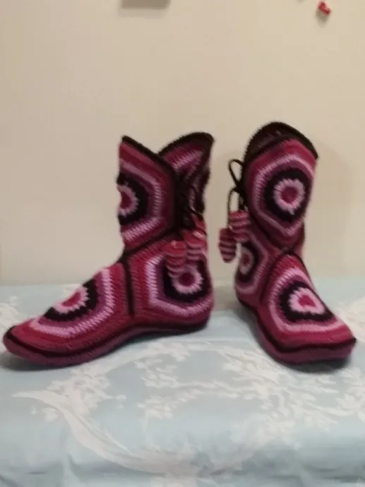 Дочери к 8 марта связала домашние сапожки из 6-ти угольных мотивов.