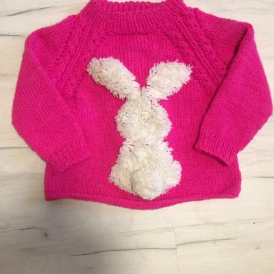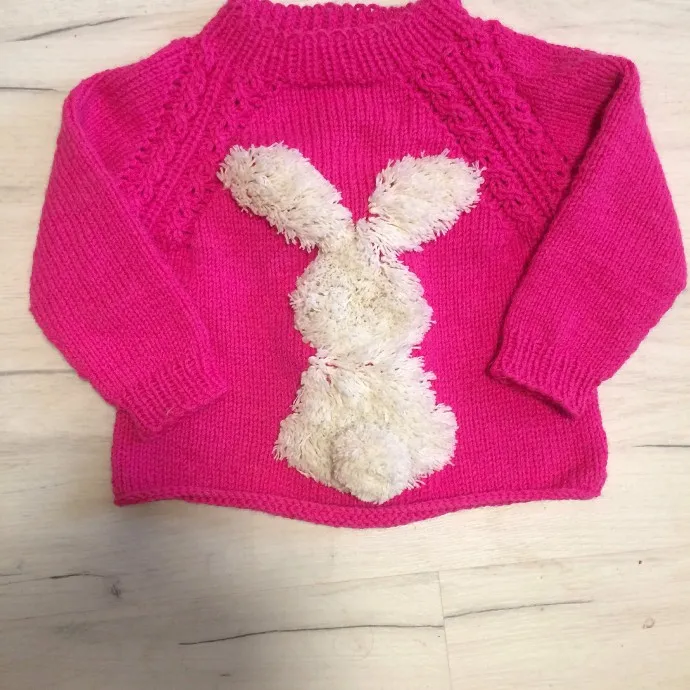 Хорошенькая кофточка! Интересный реглан и зайка, он ведь сделан по типу ковра: ниточки продёргивали сквозь вязаное полотно