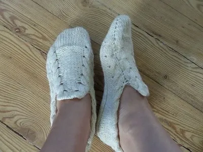 *Косичку переплетаю каждые 6 рядов и в этом ряду прибавляю накид рядом с косичкой. Смотрю, что бы было симметрично с косичкой язычка. После 20 рядов совместно провязанных с язычком, продолжаем вязать подошву в том же духе, прибавляя накиды. Если рассмотреть рисунок с лицевой стороны, то все накиды переходят в изнаночные петли, то есть следок расширяется по бокам и поднимается к пятке, а центральные 14 петель вяжем лицевыми. Когда доходим до пятки, провязываю вместе по две петли боковой (изнаночные) и центральной (лицевые) петли симметрично, пока изнаночными петлями. Так постепенно центральная часть сходит на нет, а боковые части "встречаются". Собираю на одну нитку в шахматном порядке петли боковых частей - и готово!