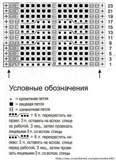 В схеме указаны лицевые (нечетные ряды-вяжем справа налево) и изнаночные ( четные ряды- вяжем слева направо). Раппорт узора 18 петель в ширину и 32 ряда в высоту. В данной схеме все изнаночные ряды вя...