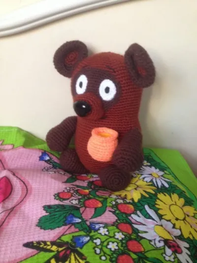 Здравствуйте дорогие девочки рукодельницы!С пылу,с жару новую работу спешу показать.Похож или нет на Винни пуха?Сначала связала без горшочка,попросил горшочек мёда,пришлось связать.Связан из акрила ,носик пластмассовый,высота игрушки 20 см.Критика принимается.Всем спасибо за комментарии!!!