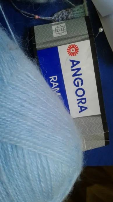 Он связан из пряжи лазурно-голубого цвета с отделкой жемчужно-серого цвета.
