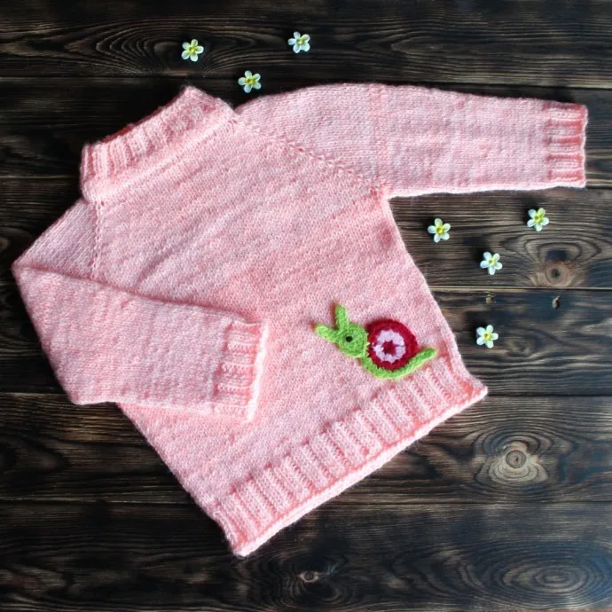 Всем привет. Маленькая похвастушка. Первый раз вязала реглан сверху. И так здорово пошло, что решила на круговых спицах и связать без швов. А ради такого дела и рукавчики связала бесшовные на 5 спицах. А улиточка связалась аппликацией (видио про улиточку по ссылке https://vk.com/video6436304_456239030 )
