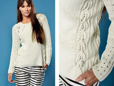 Изюминка этого джемпера кроется в оригинальном оформлении реглана и в косах, идущих по боковым сторонам модели.