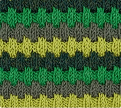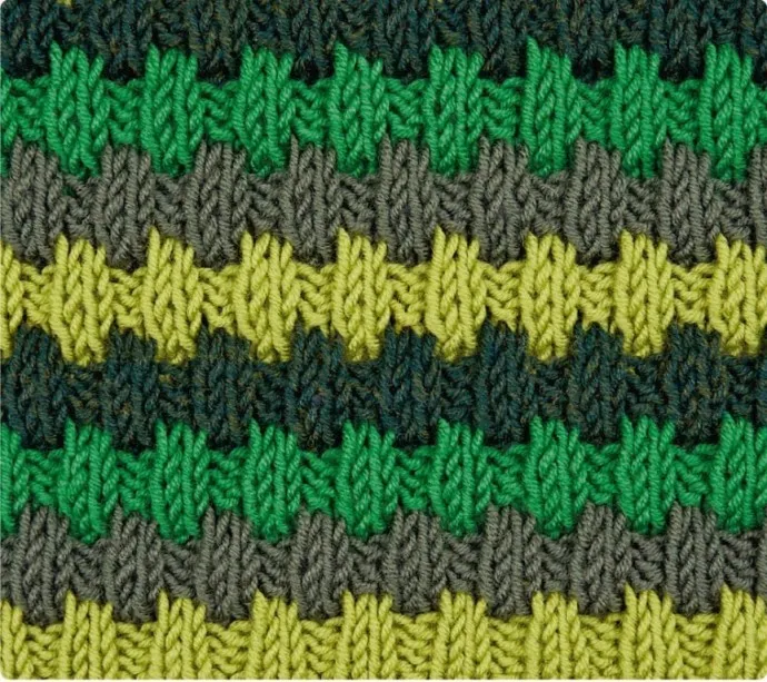 Начать с 1 кром., раппорт постоянно повторять, закончить 1 кром. 1–22-й ряды постоянно повторять. Последовательность цветов: * по 6 р. светло-зеленой, оливковой, цвета зеленой листвы и темно-зеленой нитью; от * постоянно повторять.