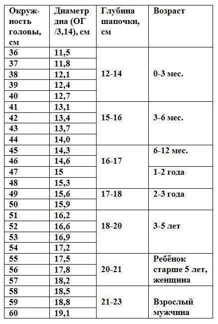 Ниже приведены размеры шапочек для всех возрастов.