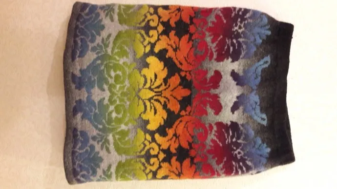 Много читала о пряже Кауни и наконец решила попробовать. Долго искала картинку жаккарда, но когда наткнулась на фото из Rowan Knitting & Crochet Magazine N54 2013,то просто потеряла сон. Мне захотелось связать юбку с таким узором. Вяжу на однофонтурной вязальной машине. Нитки купила, постирала, размотала на две части и начала вязать. В общей сложности на вязание с ручным разбором игл ушло 3 дня по 8 часов. Результат порадовал. Нитки сделали свое волшебное дело сами , но очень КОЛЮЧИЕ. Юбку пришлось сажать на чехол. Ушло на 54 размер 439 гр. ниток 400м на 100г. (8/2)