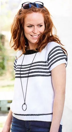 Спинка и перед: между петлями спинки и переда набрать для пройм с каждой стороны по 9 (11) 13 (15) п. = всего на спицах 264 (276) 292 (304) п. Затем нить оборвать и начать круговой ряд от середины проймы (= от линии левого бокового шва). Вязать по кругу лицевой гладью узором из полос. Когда длина изделия от краев пройм составит 28 см, связать 1 полоску (= первые 6 р. узора по схеме) и выполнить лицевой гладью 1 р. нитью белого цвета. После этого, чтобы удлинить спинку, вязать укороченными рядами следующим образом: от начала ряда (= линия левого бокового шва) провязать петли спинки и 40 п. переда, повернуть и сделать накид. Вязать в обратном направлении по изнаночной стороне и провязать петли, включая 40 п. переда с противоположной стороны, повернуть и сделать накид. Вязать по лицевой стороне в обратном направлении, но повернуть на 6 п. раньше, чем в прошлый раз (накид не учитывается), сделать накид. Вязать в обратном направлении по изнаночной стороне и повернуть на 6 п. раньше предыдущего поворота (накид не учитывается), сделать накид. Продолжить вязать так же, поворачивая работу каждый раз на 6 п. раньше с помощью накида = с обеих сторон должно быть выполнено по 16 поворотов, в результате спинка (посредине) будет длиннее переда примерно на 7 см. Закончив вязание укороченными рядами, провязать по кругу 1 р. лицевыми с лицевой стороны (на круговых спицах № 3,5), при этом накиды провязывать так: с правой стороны изделия (= правая сторона готового изделия) накид провязать вместе со следующей петлей вместе лицевой, с левой стороны (= левая сторона готового изделия) накид провязать, как 1 убавку: снять петлю перед накидом, провязать накид лицевой и потянуть снятую петлю через провязанную. Закончить работу резинкой (= *2 лиц., 2 изн.*, повторять от * до *). Через 3 см петли закрыть.