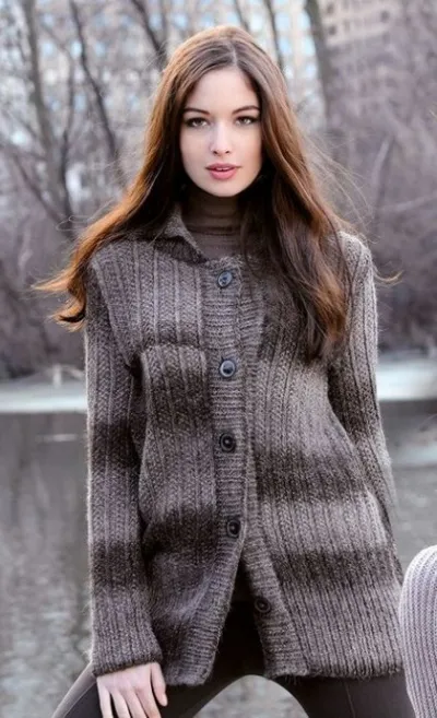 Вам потребуется: 700 (800) ((900)) г пряжи типа LINIE 310 ALPACA DEGRADE от Online коричнево-серого цвета в полоску номер 101, спицы №4,5 и 5 и 5 пуговиц диаметром 26 мм.