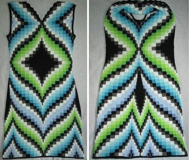 Платье начинала с вязания черного ромба, потом серой, затем белой, далее цветные ряды и т.п.