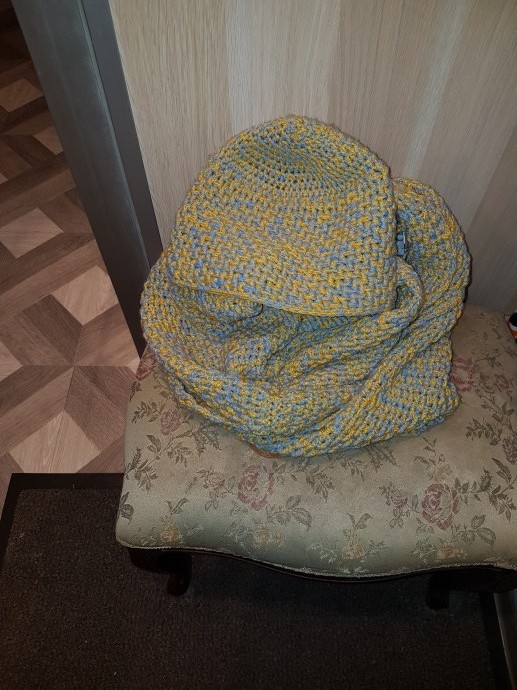 Связала из акрила рельефными столбиками с накидом. Совместила две нити: жёлтого и голубого цветов. Было бы интересно услышать ваше мнение, советы и пожелания, дорогие мастерицы