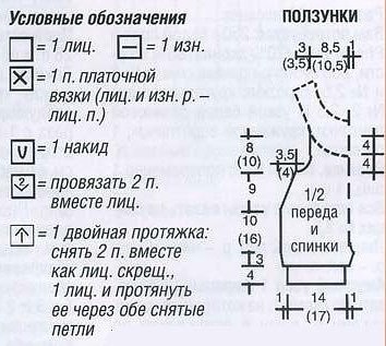 Перед: перевести на спицу петли правой и левой передней штанины = 90 (106) п. и вязать лиц. гладью. Через 10 (16) см от начала шагового закругления убавить для боковых скосов с обеих сторон в каждом 3-м р. 10 х 1 п. Через 19 (25) см от начала шагового закругления закрыть для пройм с обеих сторон в каждом 2-м р. 1 х 3, 1 х 2 и 4 (5) х 1 п. Одновременно на высоте пройм 4 см закрыть для закругления кокетки средние 14 (28) п. и с внутреннего края закрыть в каждом 2-м р.
