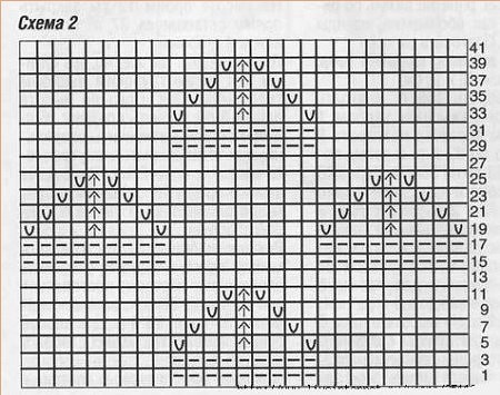 Ажурный мотив шириной 27 п.: вязать по схеме 2, на которой приведены только лиц. р., в изн. р. петли вязать по рисунку, накиды вязать изн.