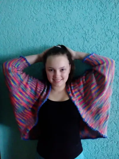 Получилась тёплая и позитивная вещь!Можно сделать одну или две застёжки,но Ангелина не захотела. Маришка сначала носом вертела,а теперь сказала,что нравится и тоже хочет,только не такое яркое.Так что теперь нужно связать и Марье.
