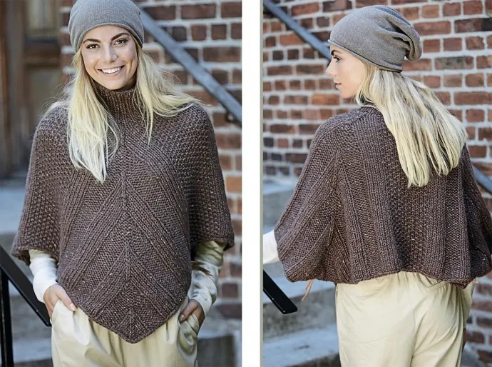 Высокий воротник этого пончо согревает шею, а кожаные шнурки, продетые по бокам модели, обеспечивают комфортную посадку.