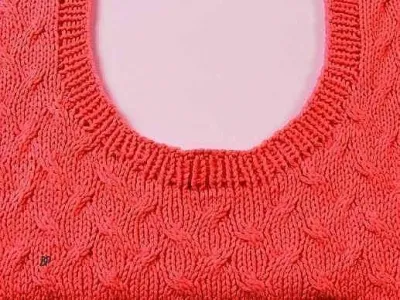 участках горловины петли набирайте таким образом, чтобы выровнять окат. А именно: спицу вводите в соответствующую петлю, но на один ряд ниже и вытягивайте нить. На ровных участках спицу вводите под кромочную петлю и вытягивайте нить. Чтобы горловина не получилась растянутой, при наборе пропускайте каждую пятую петлю. Когда все петли будут набраны, приступайте к вязанию горловины. Ее можно выполнить резинкой 1 x 1 или 2 x 2.