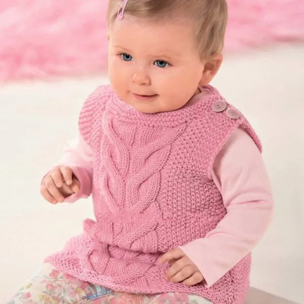 Красивый розовый жилет для девочки спицами, украшенной узором из крупных кос.