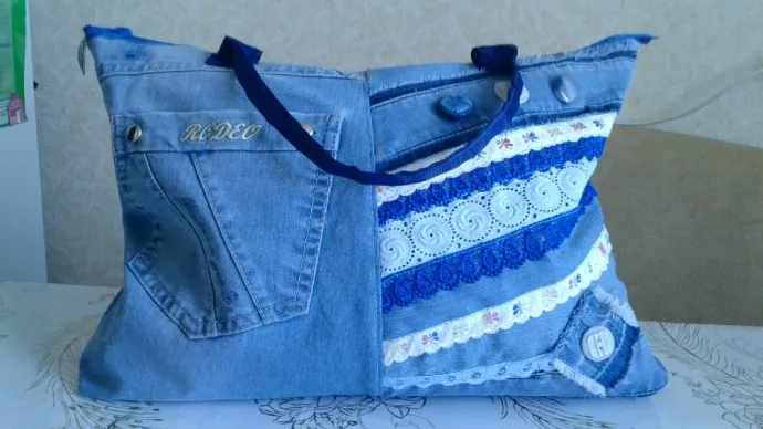 Продолжаю тему использования старых джинс. Пошила очередную сумочку, где использовала тесьму,кружева,пуговицы. Сумочка в единственном экземпляре,размер 40 на 30 см. с подкладкой и на замке. Ручки сделаны из тесьмы.