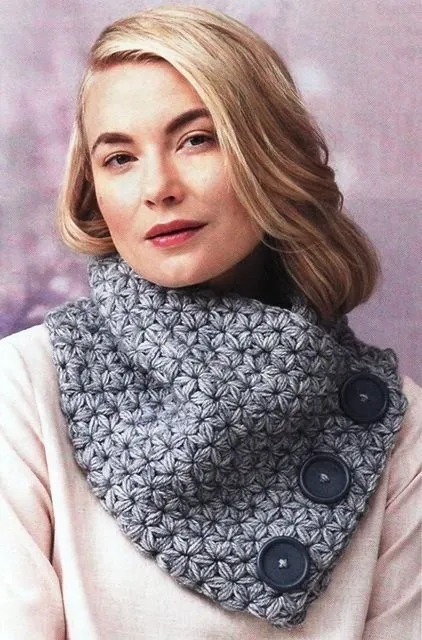 Очень теплый шарф получается при вязании крючком узора из пышных столбиков «звездочки». С помощью пуговиц вязаный шарф превращается в объемный воротник, который украсит осеннее или зимнее пальто.