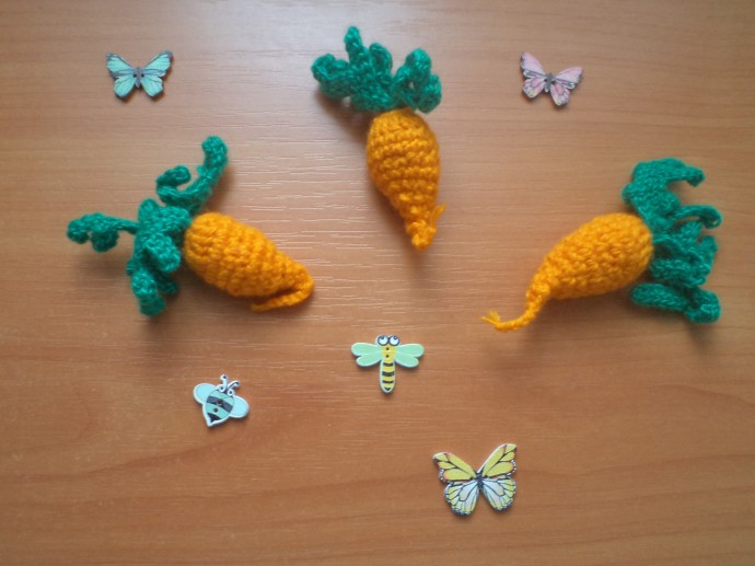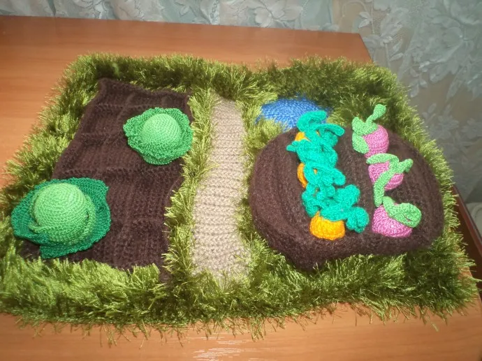 По просьбе воспитателя моего Вани связала в садик огород с овощами. Все связано крючком. Коричневая и серая нить - шерстяная, зеленая - Травка, синяя - не помню, из старых запасов. Овощи связаны ниточкой - Ирис, морковка связана ниткой из старых запасов, тоже не помню что за нитка.