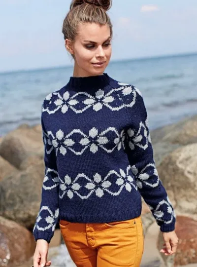 Непростой в исполнении, но очень эффектный пуловер, подчеркивающий линию шеи, украшен традиционным фарерским узором, связанным в норвежской технике.