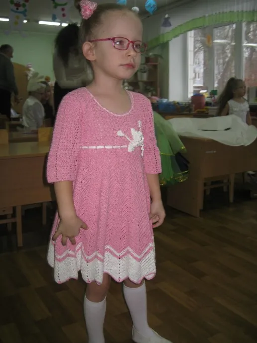 Окрылённая Вашими комментариями выставляю платье, которое вязала на утренник. Доця была светлячком и надо было однотонное платье любого цвета. В хомячьих запасах были розовые нитки, но в процессе вязания выяснилось, что их не хватает, пришлось "мудрить". И вот, что получилось.
