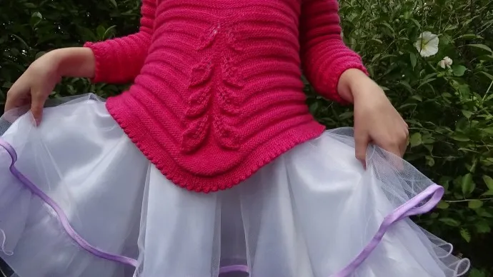 Подробный мастер-класс по вязанию детской туники с узором-листьями по регланным линиям, по центру переда и спинки (на возраст 5-8 лет). Вязание регланом сверху вниз единым полотном.
