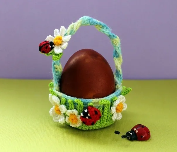 Нить обрезать, оставив кончик для пришивания. Закрутить ручку корзинки по спирали. Пришить к корзинке.