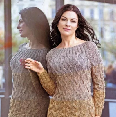 Внимание! Вяжите нитью в два сложения. Для достижения эффекта градиента вяжите сначала золотистой нитью в два сложения 20 см, затем 20 см (в рукавах – 22 см) золотистой + светло-коричневой нитью и далее до конца работы вяжите светло-коричневой нитью в два сложения.