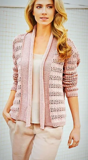 Отсутствие застежки обеспечивает комфорт в процессе носки и добавляет образу определенный шарм и стиль. Ажурные полосы чередуются с лицевой гладью, что составляет основное полотно. Связать этот кардиган может любая мастерица. Вяжется он спицами №4 и весь процесс изготовления не займет у вас много времени. Вяжите и наслаждайтесь полученным результатом!