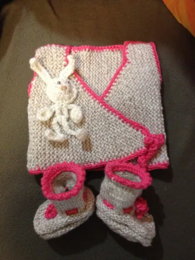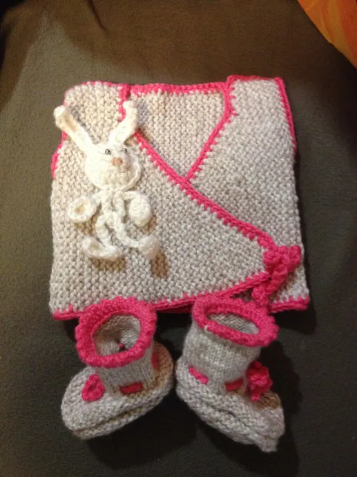 У меня ушло 100г пряжи 6мм и 50г на пинетки.)