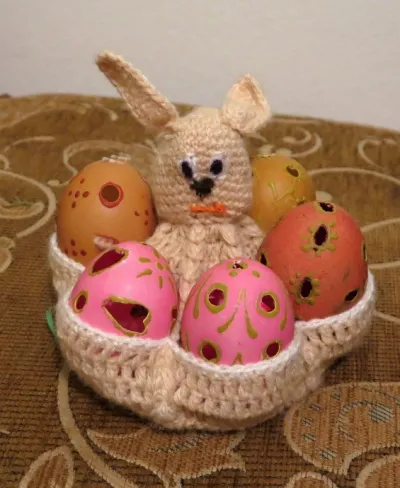 Зайка замечательный, корзиночка необычная какая то, яичка в ней как на балкончиках