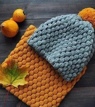 Узор "Шишечки" получается объемным, и изделия, связанные таким узором получаются особенно теплыми. Шапочка и снуд связаны из пряжи контрастного цвета серой и темно-желтой. Узор для вязания шапочки и снуда крючком вы можете посмотреть далее.