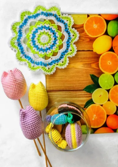 На фото - печенье макарун, орео, конфеты и тюльпаны