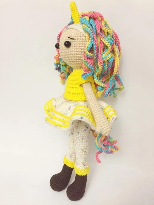 Девочка-единорожка, рост 30 см. Юбка ввязана, рубашечка расстёгивается на спинке и снимается. У единорожки есть и хвостик, такой же кудрявый как и причёска. Связана из полухлопка, наполнитель - холофайбер.
