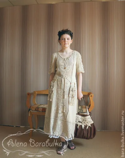 Доброго всем времени суток уважаемые рукодельницы! Знакомо ли вам ощущение, когда хочется связать что то интересненькое, но совсем простое ( после чего нибудь разноцветного и слолжного в особенности). У меня наступил момент очередного кризиса в вязании ( у меня их в вязании больших вещей бывает минимум три, сейчас- второй). Все не то и все не так и переделывать поздно. И надо чем то перебить это уныние. и решила я поискать несложную филеечку. И нашла в Пинтересте вот такой наряд: несложный, пасторально пейзанский или