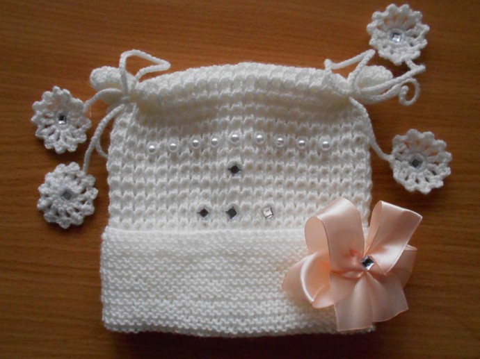 Манжеты и воротничок, бортики пинеток и отворот шапочки вязала платочной вязкой. Цветочки связала крючком. Шапочку и кофточку украсила стразами и жемчужными бусинками. Сделала бантики из атласной ленты, прикрепила с помощью клеевого пистолета. При стирке не отклеиваются, уже проверено.