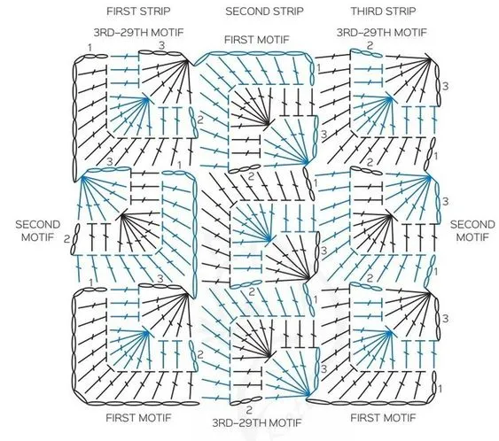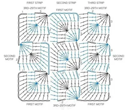 Начинать надо с нижнего левого квадрата, с 15 вп, заканчиваеся квадрат 6-ю ссн, провязанными вместе. Потом вяжется квадрат над ним. Потом третий. После этого начинается второй ряд, вяжем вниз. И т.д., следим за стрелками.