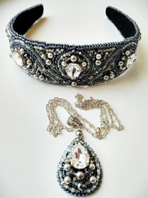 Комплект украшений "Магия". Ободок + подвеска на цепочке. Ободок и подвеска выполнены в технике "вышивка бисером и стразами" .В работе использованы прекрасные кристаллы Сваровски в форме капли в цапах ,драгоценный жемчуг Сваровски двух оттенков и размеров,сверкающие гранёные стеклянные бусины разных размеров,чешский бисер и красивая чешская сатиновая рубка. Вышивка выполнена на чёрном фетре,изнанка подвески - экокожа,изнанка ободка - фетр. Основа для ободка стальная, ручной работы - не сломается, очень надёжная,прекрасно держит форму. Ободок и подвеска выполнены в серебристо-серых оттенках.Кристаллы Сваровски сияют просто фантастически,рассыпаются сотнями искр! Весь бисер и бусины переливаются и блестят) Комплект получился очень нарядным,и в то же время,засчет сдержанной цветовой гаммы, очень благородным.