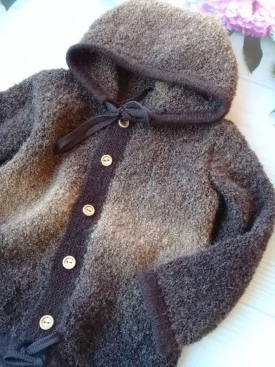 Кофточкс связана из полушерстяной буклированной пряжи. Очень теплая.