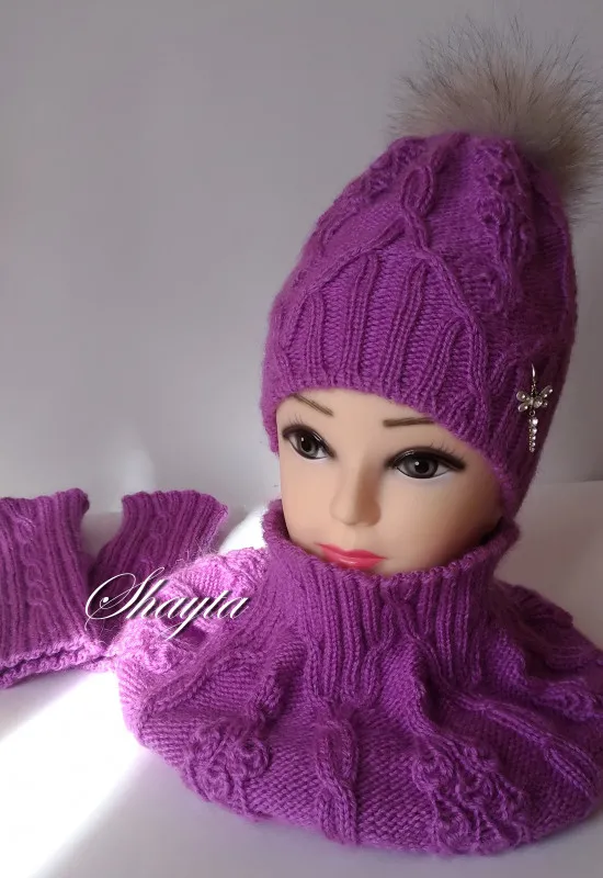 Всем здравствуйте!На этом форуме - впервые...Давайте знакомиться!Меня зовут Оксана,и мне хочется поделиться своими работами и идеями...Комплект “Вивьен” выполнен из пряжи Аляска (16%-верблюжья шерсть, 24%-шерсть, 60%-акрил), 204м-100гр. На комплект использовала 2,5 мотка, спицы круговые № 3,5 и чулочные – № 3(для макушки и митенок ), меховой помпон, комплект без швов. Высота шапочки – 23 см, высота снуда – 28 см. На шапочку набирала итальянским способом, провязала 3 ряда, потом перешла на резинку 2х2.