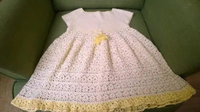 Добрый день! Недавно связала платье, к сожалению фото не передаёт цвет. Он очень красивый желто-жемчужный. Пряжа Пехорка жемчужная в 100г 425м - хлопок с вискозой. Пряжа очень послушная и хороша на лето. В пояс вставлен шнурочек с кисточками на концах