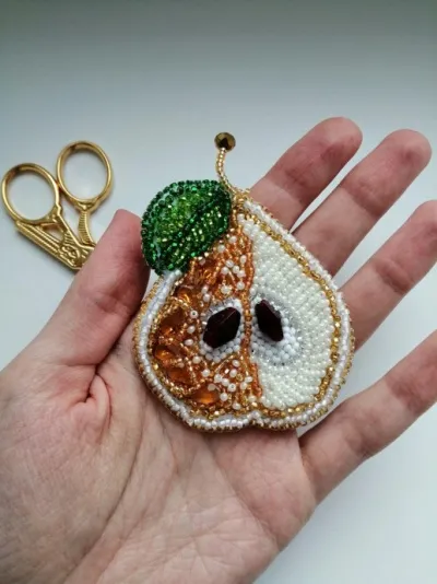 Всем привет! Я решила, что пора уже пробовать себя в самостоятельных брошах. Без использования наборов, заготовок и детальных инструкций. Вдохновляясь летом, было решено сделать "вкусную" брошку в виде груши.