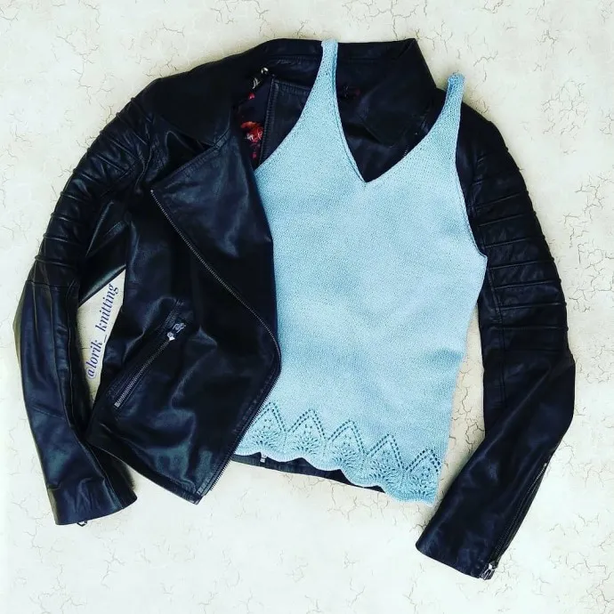 Набрать 127 петель + 2 кромочные , вяжем по схеме узором ( 1изнаночная, *18 петель узора * повторяем 7 раз от * и до * ). Низ маечки можно вязать полой резинкой 5 рядов или платочной вязкой ряда 4 ( по желанию). Далее вяжем лицевой гладью 112 рядов. В 141 лицевом ряду начинаем убавки для проймы: 3 петли лицевые, 2 вместе с наклоном влево, 117 лиц. петель, 2 вместе с наклоном вправо, 3 лиц. петли. (Убавки делаем в каждом 2-ом лицевом ряду). По краю изделия первые 3 лицевые петли вяжем полым шнуром. Вяжем 20 рядов. В лицевом ряду начинаем убавки горловины: 3 лиц. петли, 2 вместе с наклоном влево, 46 лиц. петель, 2 вместе с наклоном вправо, 3 лиц. петли. Таким образом вывязываем каждую лямку, делая убавки с обеих сторон, до получения 20 петель на спице. Далее убавляем только со стороны горловины, до получения 10 петель на спице. Провязываем ещё 17 рядов без убавок. Зеркально вяжем вторую лямку. (Можно вязать две лямки одновременно).