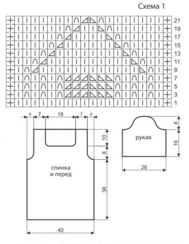 Перед: набрать на спицы 105 петель и вязать платочной вязкой, в высоту выполнить 6 рядов. Затем вязать основным узором по схеме 1. На высоте 36 см от наборного края, для пройм, с обеих сторон детали закрыть по 4 п. и в каждом 2-м ряду закрыть 1 раз по 3 п., 1 раз по 2 п. На высоте 44 см от наборного края, для выреза горловины, закрыть средние 35 петель и обе стороны вязать отдельно. Для закругления, со стороны выреза, закрыть 1 раз 3 п., 1 раз 2 п., 3 раза по 3 п. Дальше вязать прямо. На высоте 54 см от наборного края закрыть все петли.